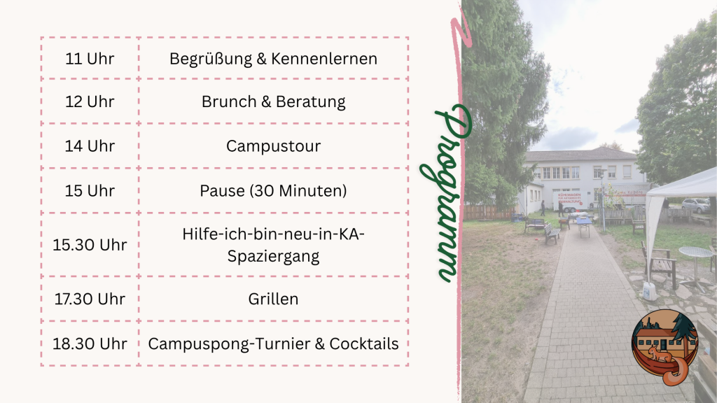 Die O-Phase für das Sommersemester 2026 findet bei gutem Wetter im Innenhof des Franz-Schnabel-Hauses statt (Gebäude 30.91), bei schlechtem Wetter stehen uns die umliegenden Räume zur Verfügung.